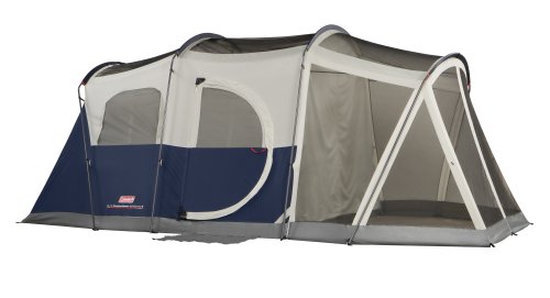 From the built-in lighting system, to the screened porch, to the hinged door and Auto-Roll window design, to Coleman's WeatherTec system guaranteed to keep out wind and rain, the Coleman Elite Weathermaster 6 Screened Tent is packed with features for comfort and convenience at the campsite. The tent sleeps 6 people comfortably in 2 rooms, with a footprint of 17'x9' and a center height of 6'8". The hinged door swings open and closed; it includes a rigid pole frame support structure that is easy to install and take down. The 2nd door zips closed securely. The integrated LED lighting system provides a bright, useful light -- enough to read by at night -- with 3 settings (High, Low, and Nightlight). Coleman's Comfort System allows control of airflow with vented Cool-Air Port/Cooler Port, privacy vent window, interior gear pocket and electrical access port. Color-coded 19mm steel and 6.3mm fiberglass poles, continuous pole sleeves plus InstaClip attachments and an exclusive pin-and-ring design assure quick and easy setup even for beginners. Coleman's new Auto-Roll Window lets you instantly roll windows up, partially up to your liking, or all the way down, to suit your privacy or ventilation preference. "Negative-angle" windows allow the window to be partially or fully open during a mild rain: a primary structural pole creates an overhang to protect the window and provide ventilation and viewing during an afternoon shower or gentle nighttime rain.