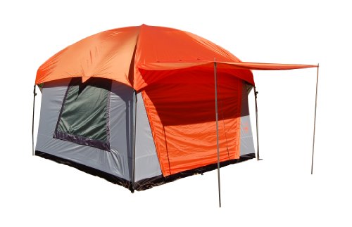 Made of nylon ripstop top with silicone waterproof coating Awning-poles included Adjustable removable mesh gear loft included Rainfly includes a large awning for an outside seating area Large main door can be unzipped ...